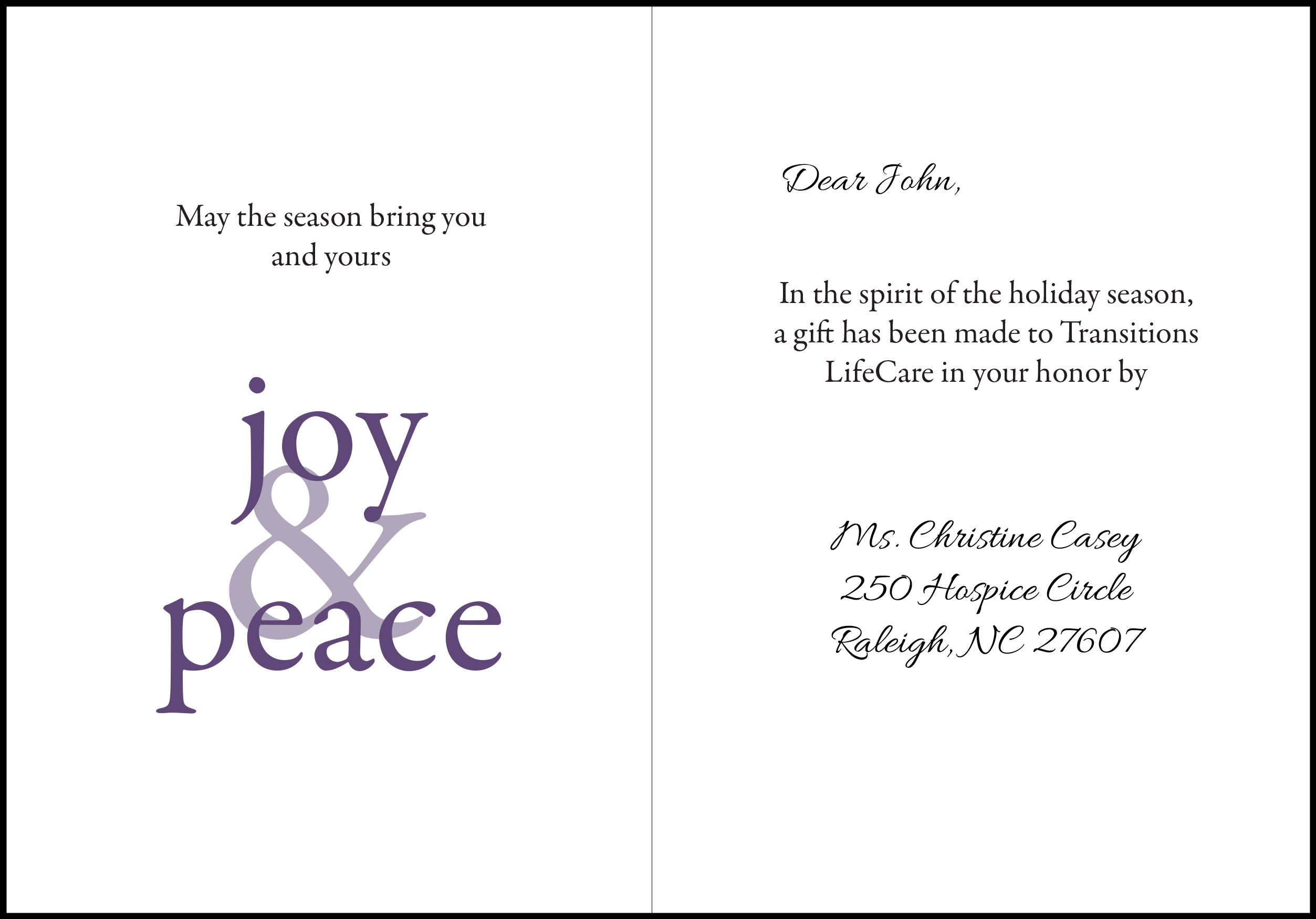 This holiday season, honor your loved ones and colleagues with a greeting card that gives back. Your holiday greeting cards will help Transitions LifeCare continue to give each patient and family our special gift of joy & peace!